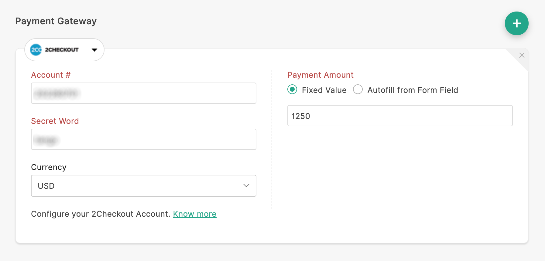 - Ingrese el monto del pago . Puede establecer una cantidad fija para el pago o autocompletar la Cantidad de pago con un valor de un campo de formulario.