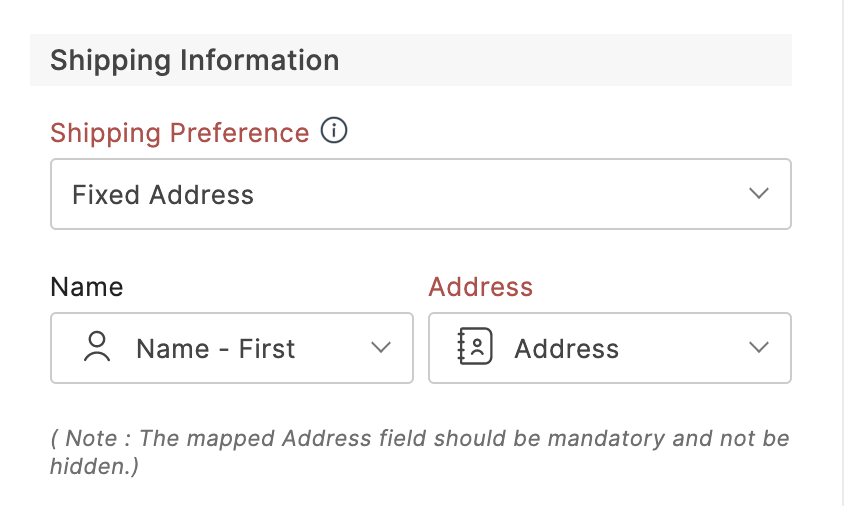 - Dirección fija : esta preferencia no le proporcionará al respondedor del formulario la opción de editar su dirección de envío en la página de pago de PayPal. Después de seleccionar esta opción, asigne los campos de Nombre y Dirección de PayPal con los campos de formulario relevantes como se muestra a continuación-