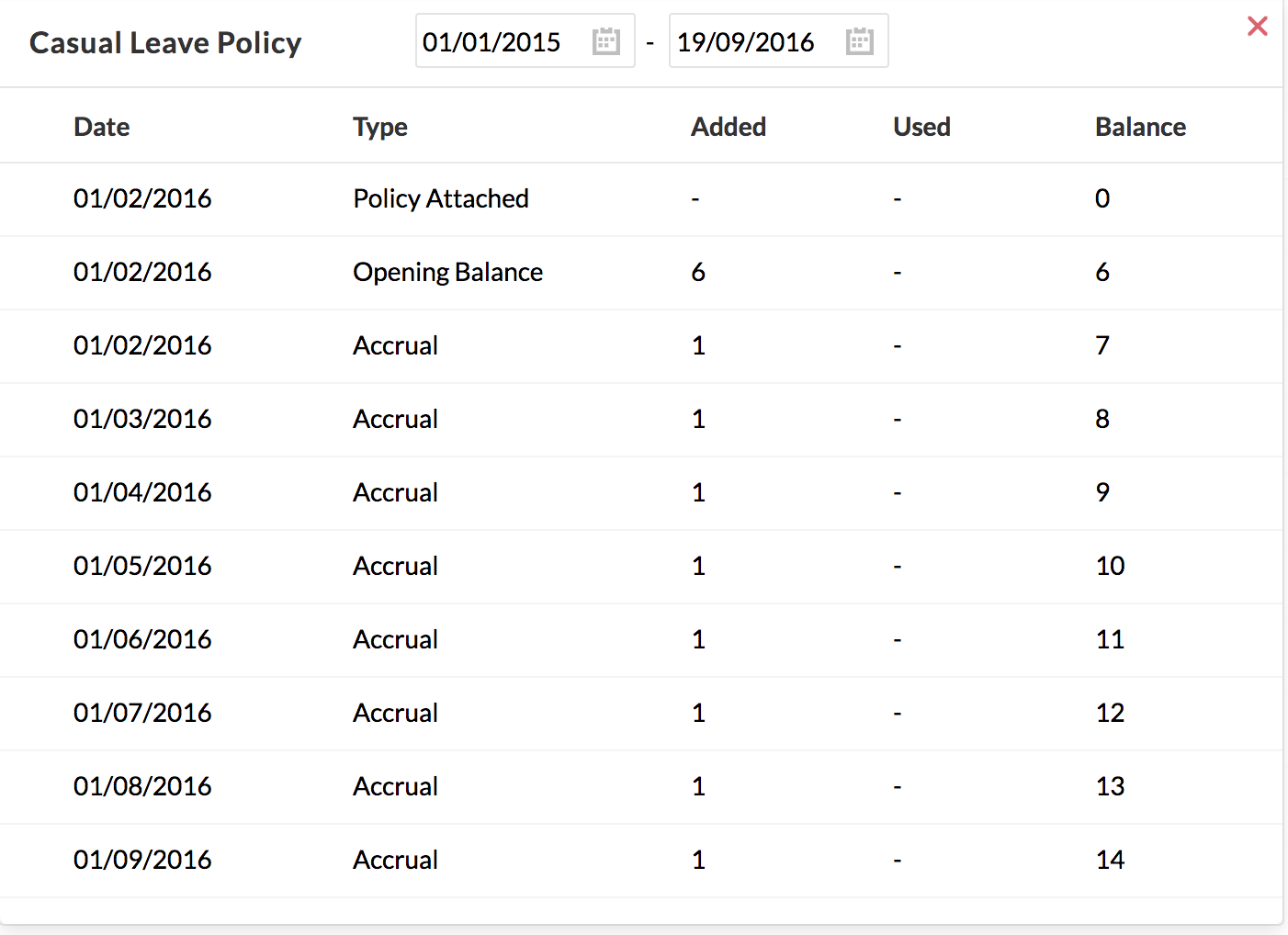 Aquí, se acreditan 10 días de licencia a un empleado. De los 10 días, se deducen 8 días ya que son parte de los días festivos, que según la política es parte de la licencia con derecho para todos los empleados. Por lo tanto, la licencia disponible para el usuario permanece en 2 (10-8), que puede solicitar según sea necesario.